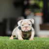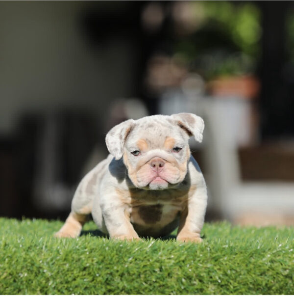 Welcome FUTURE, our stunning LILAC MERLE MICRO English Bulldog future stud, born (1o/10/25) and developing beautifully! His silver blue eyes are to die for! He’s located in beautiful Southern California. FUTURE boasts a rare and exquisite lilac tan tri-color coat that’s sure to capture hearts. With his gentle and playful demeanor, he is not only beautiful but also affectionate and loving. He comes from a Champion Bloodline and award winning Stud.