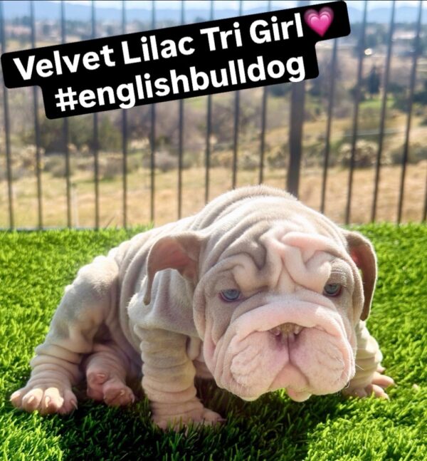 LATTO is our Gorgeous Velvet Lilac Tri Female English Bulldog.