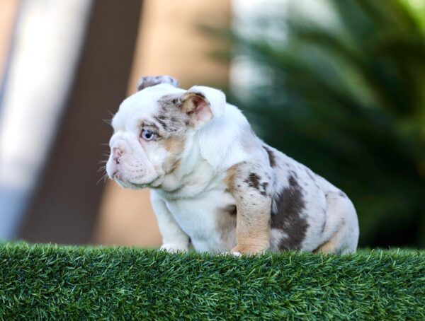 MAUI is our one of a kind Chocolate Merle Tri English Bulldog female.