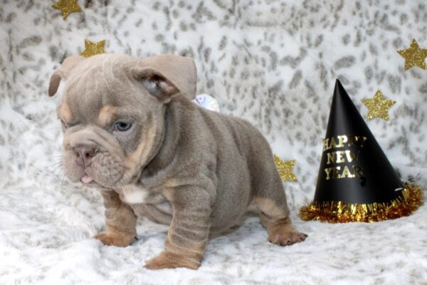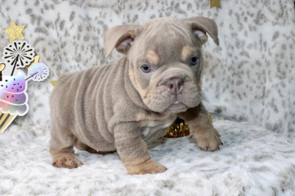 SELENA is our captivating Lilac Tri English Bulldog female with a striking smushed face and mesmerizing eyes.